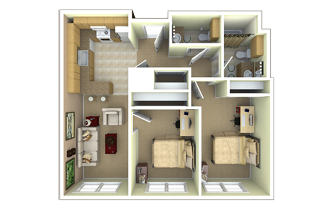 UPA houses 749 residents in suite-style rooms within an upscale apartment community. The suites are either arranged in a 2-bedroom/2-bath doubles configuration or in a 2-bedroom/1.5-bath single style. University Park overlooks Gettler Stadium.