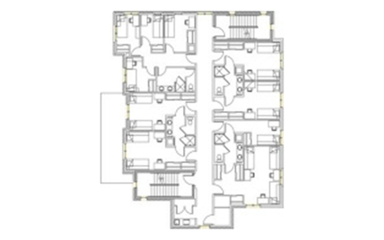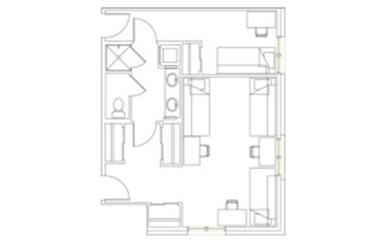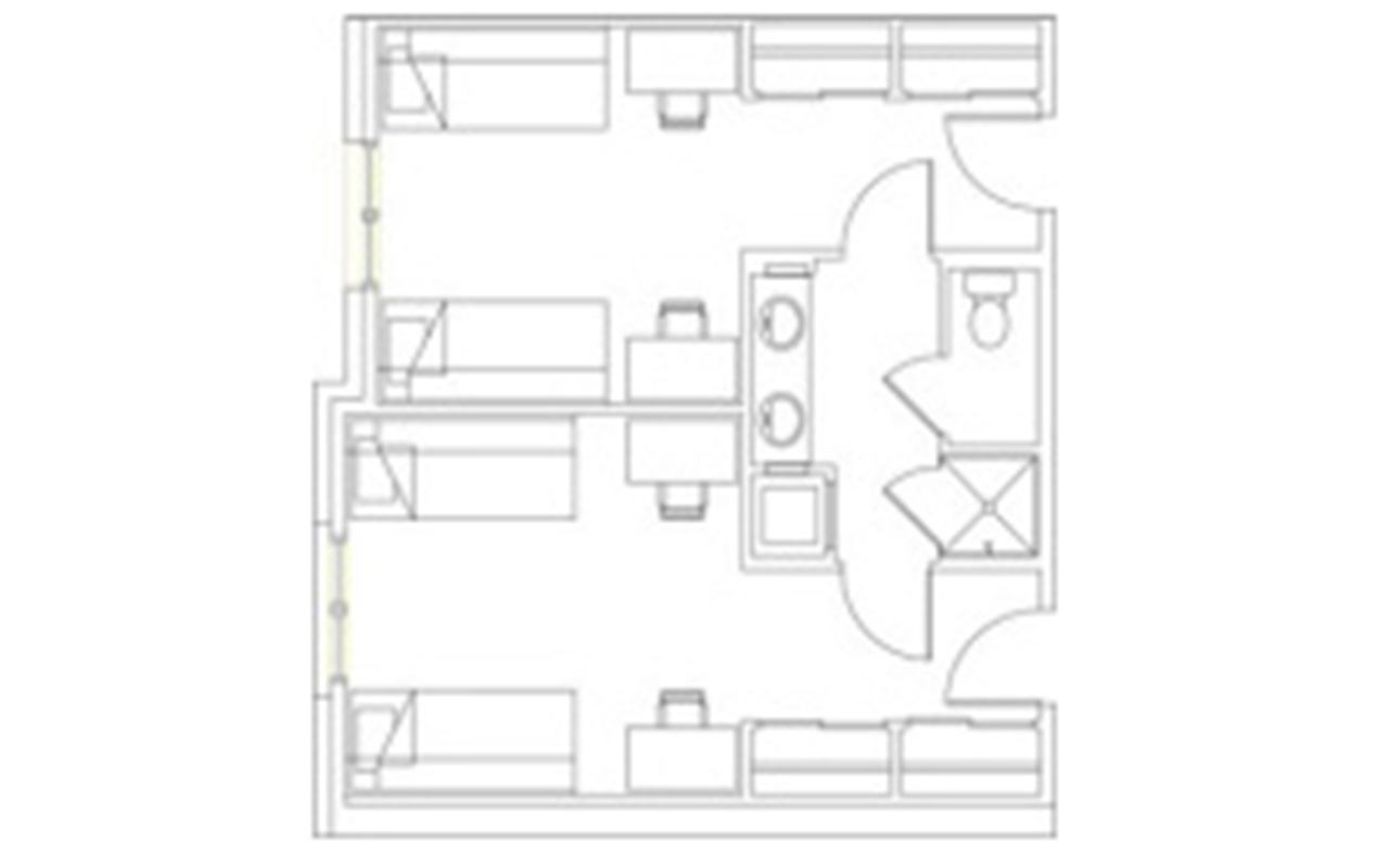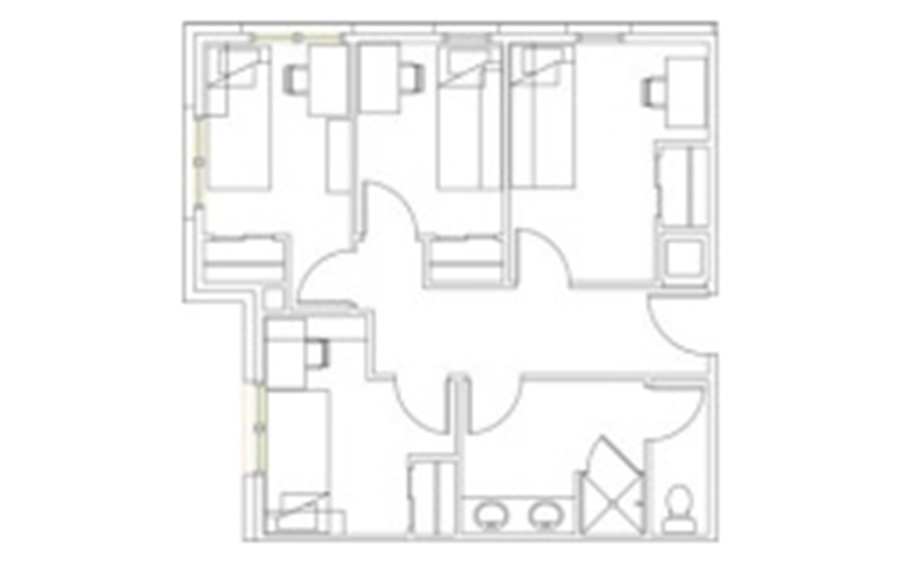 There are a variety of room types available at Stratford Heights. Students have the option to choose four-person suites in three configurations: